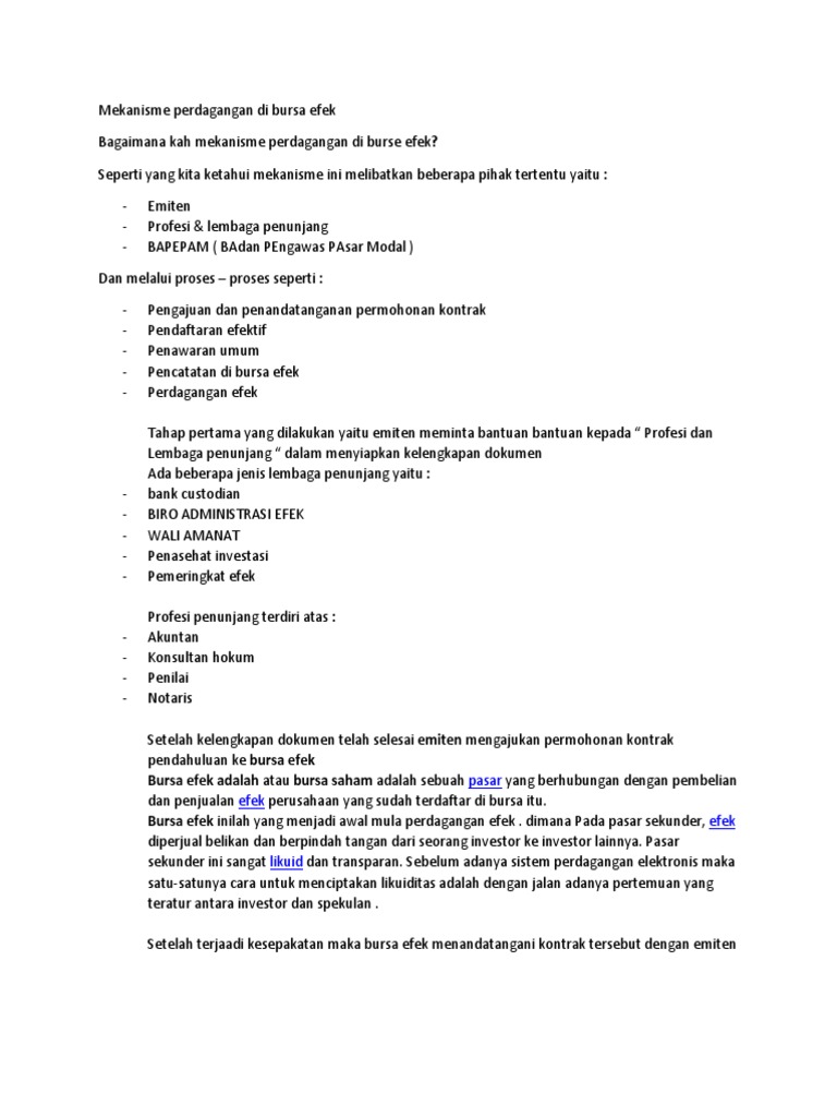 Mekanisme perdagangan saham di bursa efek. Perdagangan efek di bursa hanya dapat dilakukan oleh anggota bursa (ab) yang juga menjadi anggota kliring kpei. Perdagangan efek di bursa hanya dapat dilakukan oleh anggota bursa (ab) yang juga menjadi anggota kliring kpei. Untuk menentukan mana yang terbaik kembali kepada jenis, sifat, karakteristik dan kebutuhan perusahaan.
